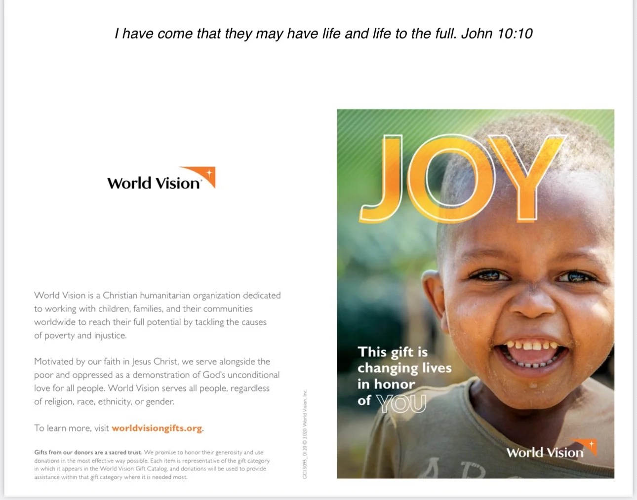 For your Donation to World Vision